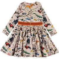 Christin er en langærmet kjole i lyserød med all-over printet 'Tree of Life pink', som er fyldt med mange forskellige dyr og et par rummænd imellem. Kjolen har stribet orange bånd i taljen og lynlås i nakken.