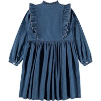 Langærmet blå kjole i økologisk bomulds-chambre. Kjolen har flæsekanter der løber på fronten, over skuldrene og bagpå, samt lille kinakrave. Ærmerne har knaplukning ved håndled og kjolen har knaplukning foran hvilket gør den nem at iføre sig.