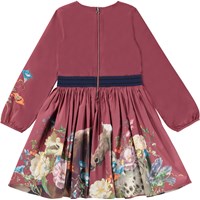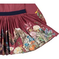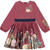 Christine er en bordeauxrød kjole med print af heste og blomster. Kjolen har elastisk talje og lynlåslukning i nakken.