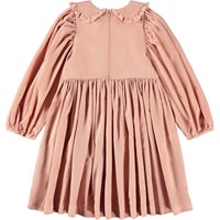 Rosa knælang kjole i økologisk fløjl med lange ærmer. Kjolen har rund halsudskæring, rund krave med blondekant, skørt med masser af volumen, samt et oversize fit. Ærmerne har elastik i bunden samt masser af rynk for volumen.
