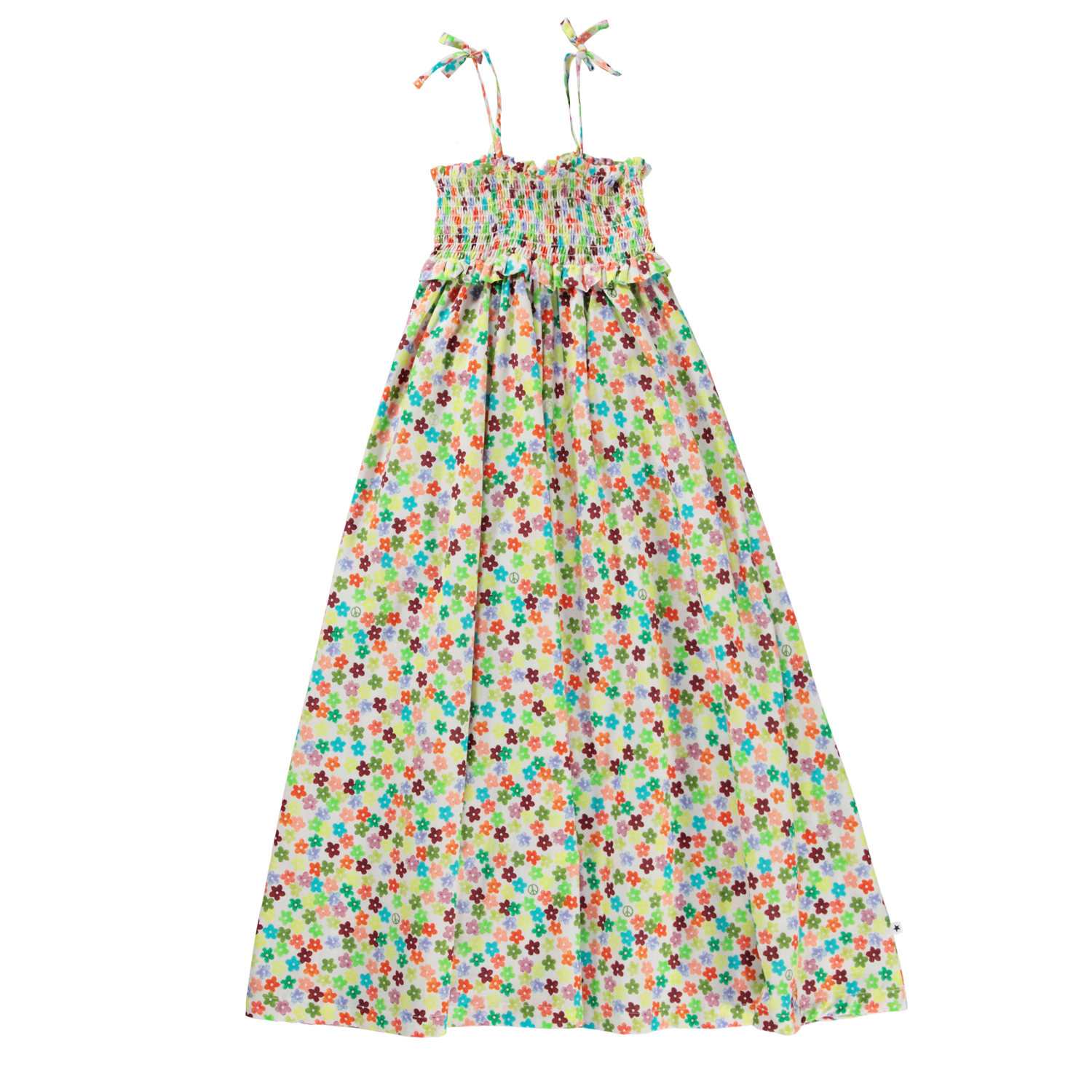 Let, lang solkjole med bindestropper, i 100% økologisk bomuld. Printet er baseret på små, håndmalede akvarel blomster i alverdens farver, og ser man godt efter, kan man måske finde et peacetegn eller to. Kjolens top er i smock og stopperne er justerbare, som sikrer en behagelig pasform i sommervarmen. Kjolen har en almindelig pasform.