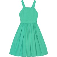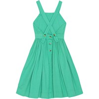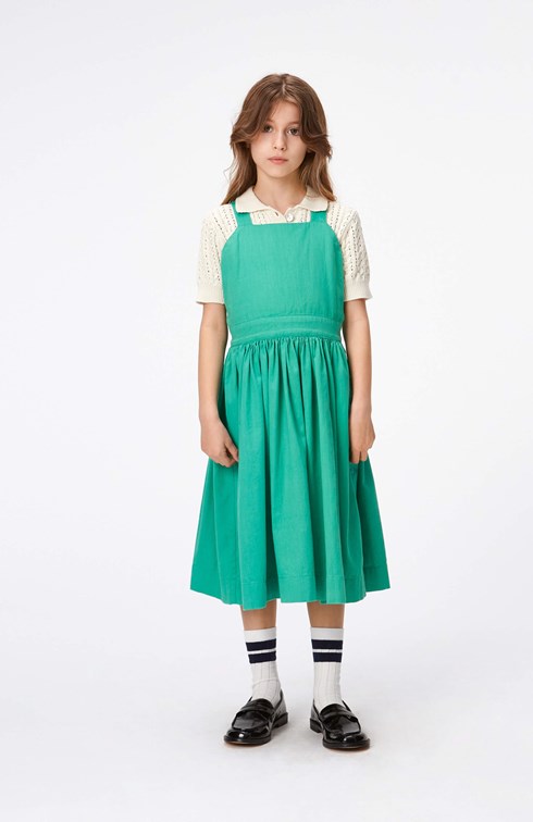 Grøn kjole med justerbare stropper. Kjolen har et fast taljestykke med knaplukning bagpå, der går ned i skørtet og gør den nem at komme i. Kjolens skulderstropper krydser på den åbne ryg, og kan justeres i tre forskellige længder. Skørtet er rynket i taljen og giver kjolen flot volumen.