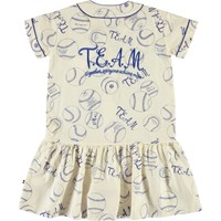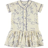 Cibi er en sporty kjole i hvid med blåt baseball print og blå pipings. Kjolen har korte ærmer og knappe lukning ned langs fronten.