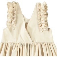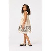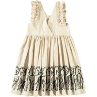 Beige knælang kjole i økologisk bomuld med flæsekant ved ærmegab. Kjolen har en løs pasform og V-udskæring i ryggen samt et sort malet print på skørtet af galoperende heste.