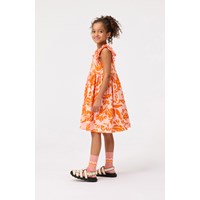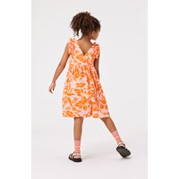 Lys orange knælang kjole i økologisk bomuld med flæsekant ved ærmegab. Kjolen har en løs pasform og V-udskæring i ryggen samt et orange allover print af blade og teksten "We are nature".