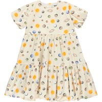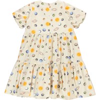 Cieanna er en beige kjole med print af sol, måne og planeter. Kjolen har korte ærmer og lynlås lukning i nakken.