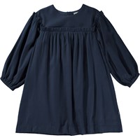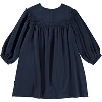 Mørkeblå knælang kjole med flæse detalje. Denne kjole er fremstillet i en blød bomulds/viskose blanding, der giver kjolen et flot fald. Den har en rund halsudskæring, skjult lynlås i ryggen, lange ærmer med volume og flæse detalje ved skulderen, bærestykke med med flæsedetalje, samt et loose fit.