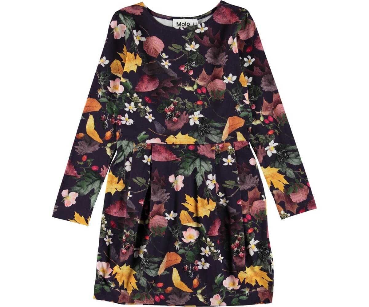 Cindarell er en langærmet kjole med print af forskellige bær, blomster og farvede blade. Kjolen har lange ærmer og en facon som følger kroppen uden at være figursyet og stram.