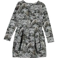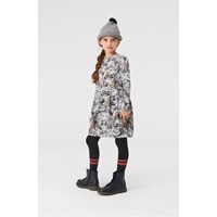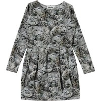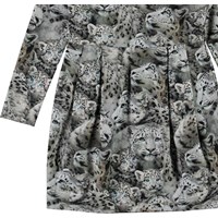 Cindarell er en langærmet kjole med print af sneleoparder. Kjolen har lange ærmer og en facon som følger kroppen uden at være figursyet og stram.