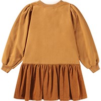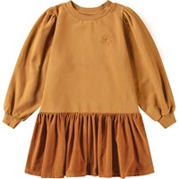 Gyldenbrun jerseykjole i økologisk bomuld. Kjolen har en afslappet pasform samt ribkanter ved halsen og ved ærmerne. Et broderet hjertekløver ved brystet og det bløde mini-fløjlsskørt tilføjer en ekstra dimension til dit barns stil.