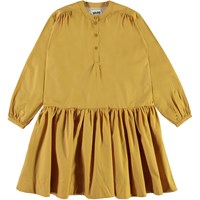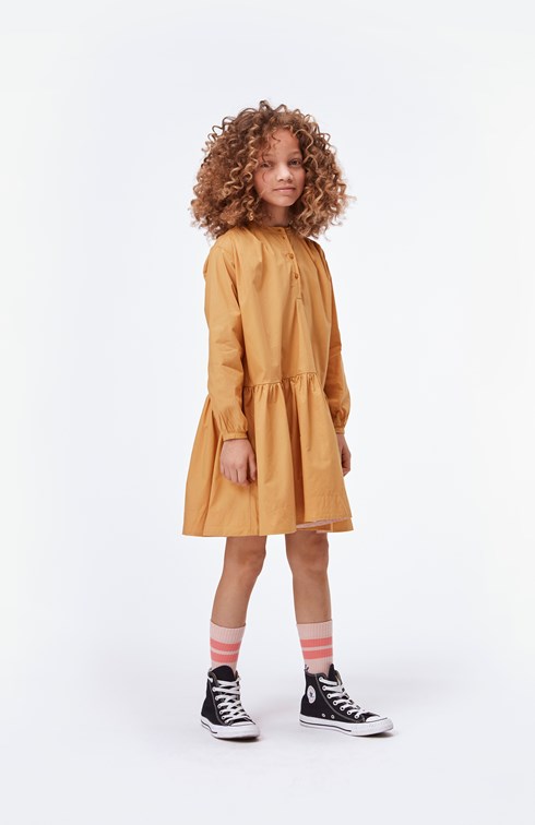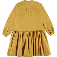 Cinzia er en bomulds poplin kjole i sennepsgul med lange ærmer. Kjolen har en flot volumen, som falder flot. Certificeret af Ecocert Greenlife, certifikationsnr. 197496.