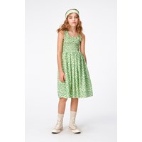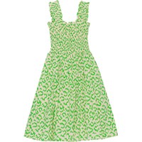 Knælang kjole i grøn leopard print. Toppen er syet med elastisk smock-effekt og med dens brede stropper sidder den behageligt og flot. Skørtet er syet på i taljen og har masser af volumen.