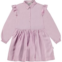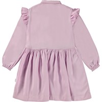 Lyserød knælang skjortekjole med flæsedetaljer ved skuldrene. Denne kjole er fremstillet i 100% viskose, der giver kjolen et flot og let fald. Den har skjortefrave med stolpelukning, hvide knapper, lange ærmer med elastik for enden, flæser ved skulder, rynket skøært med volume, samt et loose fit.