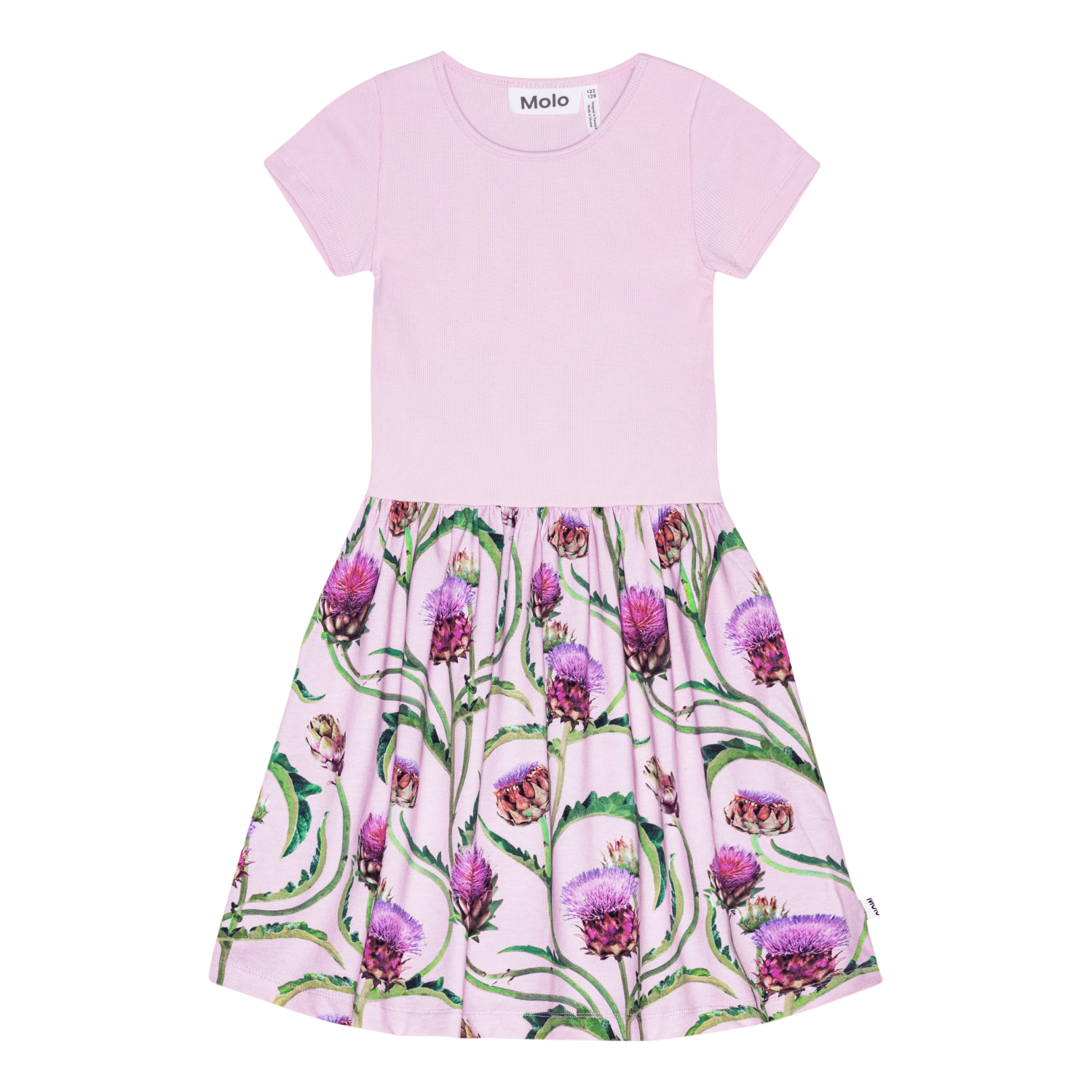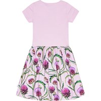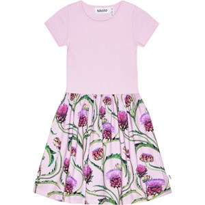 Kortærmet lyserød kjole med rundskåret skørt i økologisk bomuld. Toppen er tætsiddende i ribbet jersey, der gør den nem at komme i og behagelig at have på. Skørtet er i en bomulds poplin, har et multifarvet alloverprint af artiskokblomster i røde og lilla nuancer.