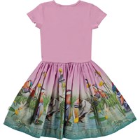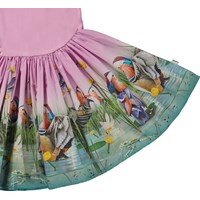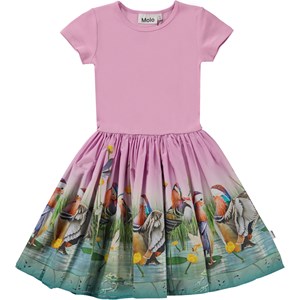 Cissa er en pink, kortærmet kjole med rundskåret skørt, i økologisk bomuld. På toppen er Cissa en ribbet jersey, mens bunden er bomulds poplin. På skørtet er der printet en scene fra den smuk dam, med åkander og eksotiske fugle.