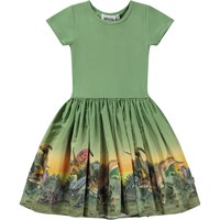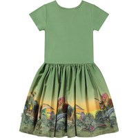 Grøn knælang kortærmet kjole med poplinskørt med dinoprint. På printet er der brugt levende og klare farver, alle dino vennerne står og kigger nysgerrigt i den samme retning. På ærmet har de fået øje på noget nyt. Er det en ny art? Måske er det dem, der måske kommer til at overtage jorden efter dinosaurerne? Måske de kan mærke en ny ære puste dem i nakken. Denne kjole er fremstillet i 100% bomuld, har en rund halsudskæring, korte ærmer, poplinskørt med masser af volume, samt et slim fit.
