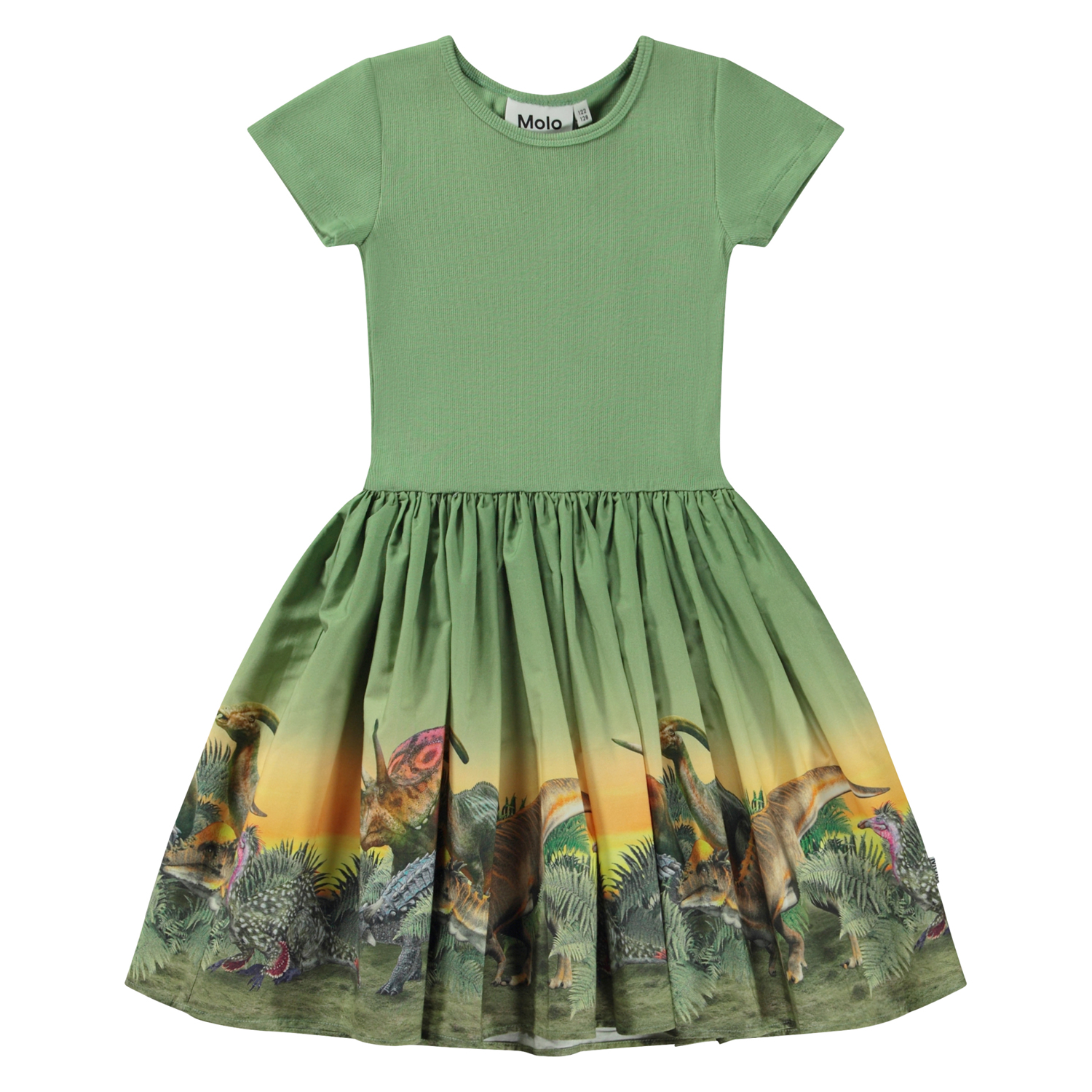 Grøn knælang kortærmet kjole med poplinskørt med dinoprint. På printet er der brugt levende og klare farver, alle dino vennerne står og kigger nysgerrigt i den samme retning. På ærmet har de fået øje på noget nyt. Er det en ny art? Måske er det dem, der måske kommer til at overtage jorden efter dinosaurerne? Måske de kan mærke en ny ære puste dem i nakken. Denne kjole er fremstillet i 100% bomuld, har en rund halsudskæring, korte ærmer, poplinskørt med masser af volume, samt et slim fit.