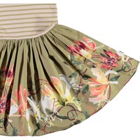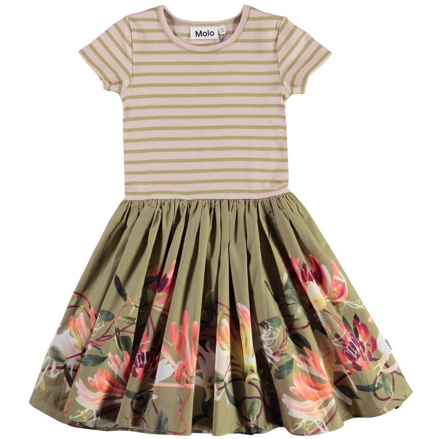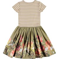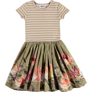 Cissa er en kjole med rosa og grøn stribet overdel i rib med korte ærmer og et feminint poplin skørt i grøn med blomster print.