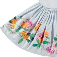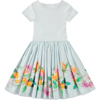 Lyseblå kortærmet kjole i økologisk bomuld med tætsiddende ribbet jerseytop og poplin nederdel. Kjolen har en almindelig pasform med et print på nederdelen af et farverigt blomsterprint i orange og lyserøde farver.