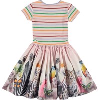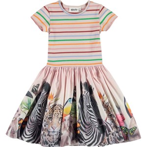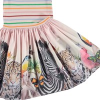 Cissa er en kjole med multifarvede stribet overdel i rib, samt med korte ærmer og et feminint poplin skørt, som har print af junglens mange dyr.