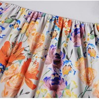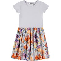 Lyslilla kortærmet kjole i økologisk bomuld med tætsiddende ribbet jerseytop og glat jersey skørt. Skørtet har et farverigt print af blomster på en lilla baggrund, der giver kjolen et frisk og livligt udtryk.