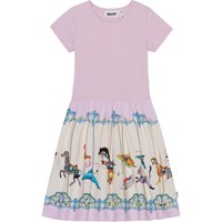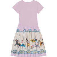 Kortærmet lilla kjole med rundskåret skørt i økologisk bomuld. Toppen er tætsiddende i ribbet jersey, der gør den nem at komme i og behagelig at have på. Skørtet er i en bomulds poplin, har et alloverprint af en tivoli karrusel med farverige dyr.