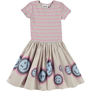 Cissa er en, kortærmet kjole med rundskåret skørt, i økologisk bomuld. På toppen er Cissa i ribbet jersey i taupe med pink striber, mens bunden er bomulds poplin. På bunden af skørtet er der printet spraymalede smilende ansigter i blå og lyserød.