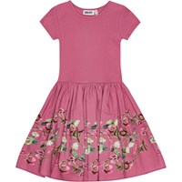 Lyserød kortærmet kjole til de mindste i økologisk bomuld. Toppen er tætsiddende i en ribbet jersey, mens skørtet er i en glat jersey. Printet på kjolens skørt viser killinger i sportstøj omgivet af bolde og formidler et budskab om, hvordan sport og leg kan berige venskaber og relationer.