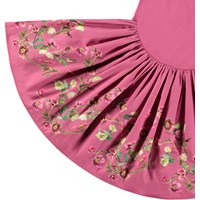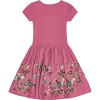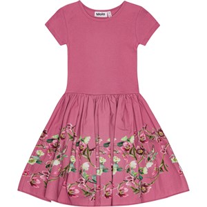 Rosa kortærmet kjole til de mindste i økologisk bomuld. Toppen er tætsiddende i en ribbet jersey, mens skørtet er i en glat jersey. Kjolens skørt er dekoreret med et print af blomster, der tilføjer et festligt præg.