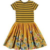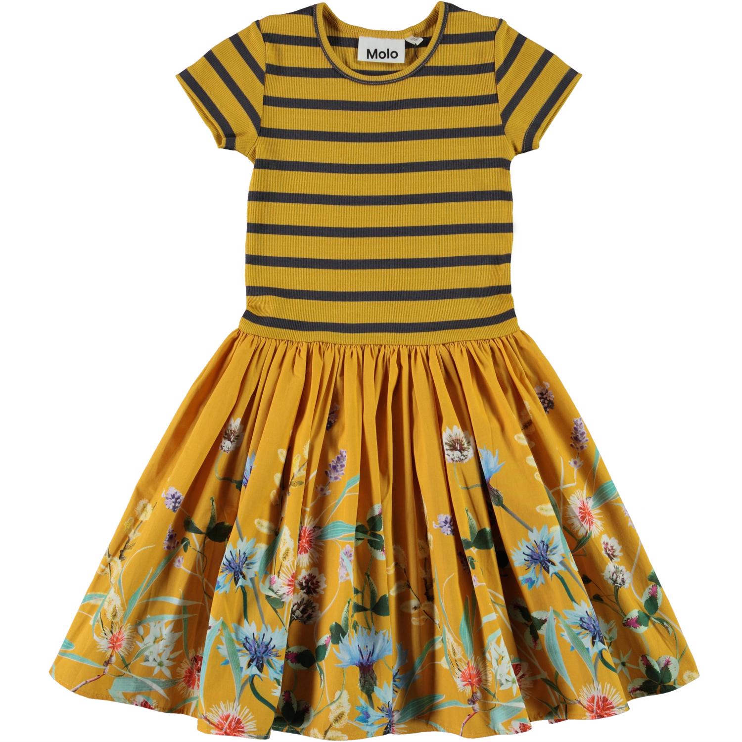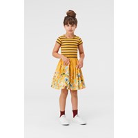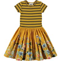 Cissa er en to-delt gul kjole med kortærmet overdel i rib, som er gul og sort stribet. Skørtet er med print af vilde blomster.