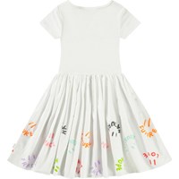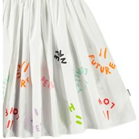 Hvid kortærmet kjole i økologisk bomuld med tætsiddende ribbet jerseytop og poplin nederdel. Kjolen har en almindelig pasform med et print på nederdelen af farverige smilende ansigter og glædesord som mund.