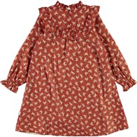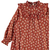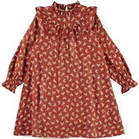 Clair er en brun vævet kjole med vævede små heste og glimmer. Kjolen har fin flæsekrave og lynlås lukning i nakken.