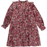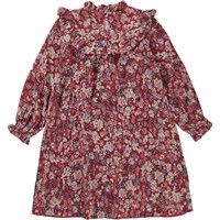 Clair er en mørkerød højhalset kjole med fint blomster print. Kjolen har desuden vævede sølv tråde i printet.