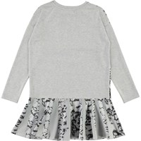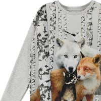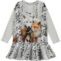 Claire er en lysegrå langærmet kjole med print af en ulv, ræv, kanin og fugl på fronten af kjolen. Kjolen har et lille skørt i bunden af kjolen.