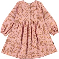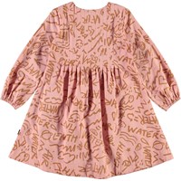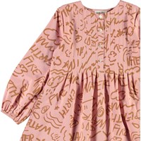Claribel er en lyserød skjortekjole med print af symboler for de fire elementer i brun. Kjolen har pliseringer ved brystet og knappelukning.