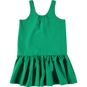 Grøn kjole uden ærmer med et lavtsiddende, volumiøst skørt.