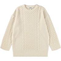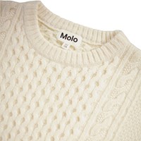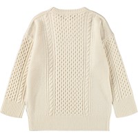 Cremefarvet strikket kjole i uld med lange ærmer. Kjolen har flot kabelmønster og brede ribkanter ved ærmer, kjolens kant og ved halsudskæringen.