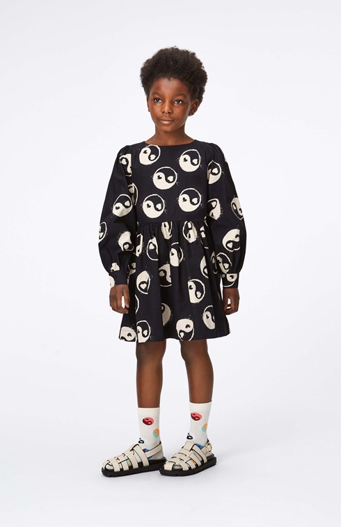 Sort knælang kjole i økologisk bomuld. Kjolen har rund hals, lange ærmer med manchet lukning og en usynlig lynlås i ryggen, der gør den nem at komme i. Kjolen er løs med et snit i taljen der rynker, det giver skørtet en flot volumen. Printet på kjolen er et alloverprint af sorte og hvide Yin og Yang tegn.