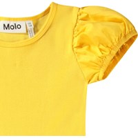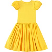 Kortærmet gul kjole til børn i økologisk bomuld med en tætsiddende jerseytop og et voluminøst skørt i bomuldspoplin. Kjolen har en rund hals og små pufærmer med elastik.