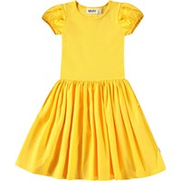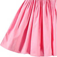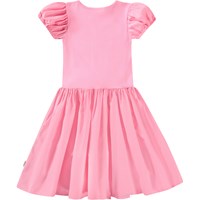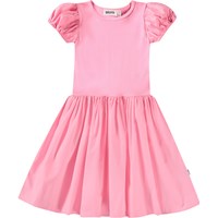 Kortærmet pink kjole i økologisk bomuld med en tætsiddende jerseytop og et voluminøst skørt i bomuldspoplin. Kjolen har en rund hals og små pufærmer med elastik.