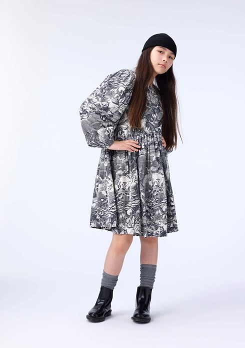 Kort kjole i økologisk viskose. Kjolen har et farverigt blomsterprint. Kjolen har en rund udskæring, er let oversize og har masser af rynk ved ærmer samt ved skørtet. De lange ærmer elastik ved håndleddet, der tilføjer ærmet fylde. Kjolen er let at komme i med den usynlige lynlås placeret på ryggen.