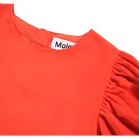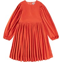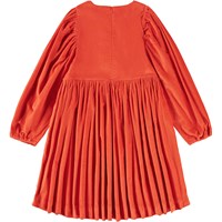 Elegant orange kjole med rødt skær i blød velour. Kjolen er knælang og oversize med masser af rynk ved ærmerne og skørtet. De lange ærmer har elastik ved håndleddene, hvilket giver dem ekstra fylde. Kjolen er nem at få på takket være den usynlige lynlås på ryggen.