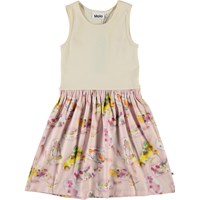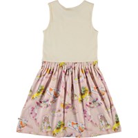 Colleen er en todelt kjole med lys overdel i rib uden ærmer, mens skørtet er lyserødt med print af blomster ispinde. Certificeret af Ecocert Greenlife, certifikationsnr. 197496.