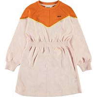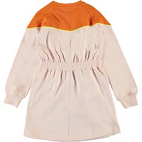 Colleta er en sporty langærmet kjole i lyserød med orange overdel og gul piping. Kjolen har elastisk talje og rib ved ærmegabene.