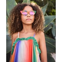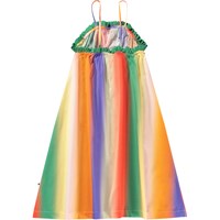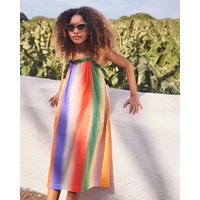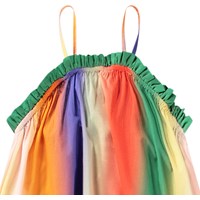 Regnbuefarvet løs kjole i økologisk bomuld. Kjolen går til midt på skinnebenet, har tynde stropper, dyb ryg samt en fin flæsekant. Kjolens materiale er let og luftigt og er ideel til poolen eller stranden.