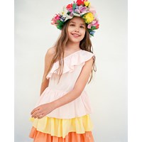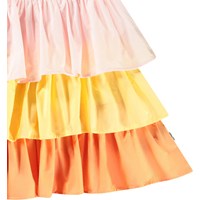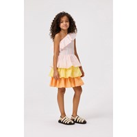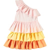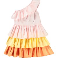 Lyserød, orange og gul one-shoulder kjole i økologisk bomuld med elastik og flæsekant over skulderen. Kjolen har en tætsiddende overdel med elastik i kanten og et skørt i tre lag flæser.