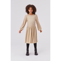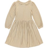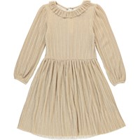 Coralia er en gylden kjole med glimmer. Kjolen har flæsekrave, lange ærmer og lynlåslukning i nakken.