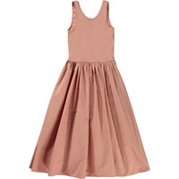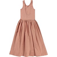 Corella er en støvet rosa, ankellang og ærmeløs kjole i økologisk bomuld. Kjolen har brede stropper, en dybere udskæring i ryggen og et skørt i økologisk bomulds poplin.