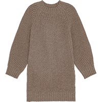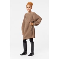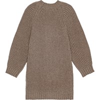 Knælang gyldenbrun strikkjole i en blød uldblanding. Kjolen har en løs pasform, raglanærmer, rund hals og strikkede ribkanter ved ærmer, hals og bunden, og er strikket i ribstrik for fleksibilitet og en flot finish i dens fine mønster.