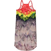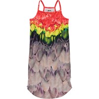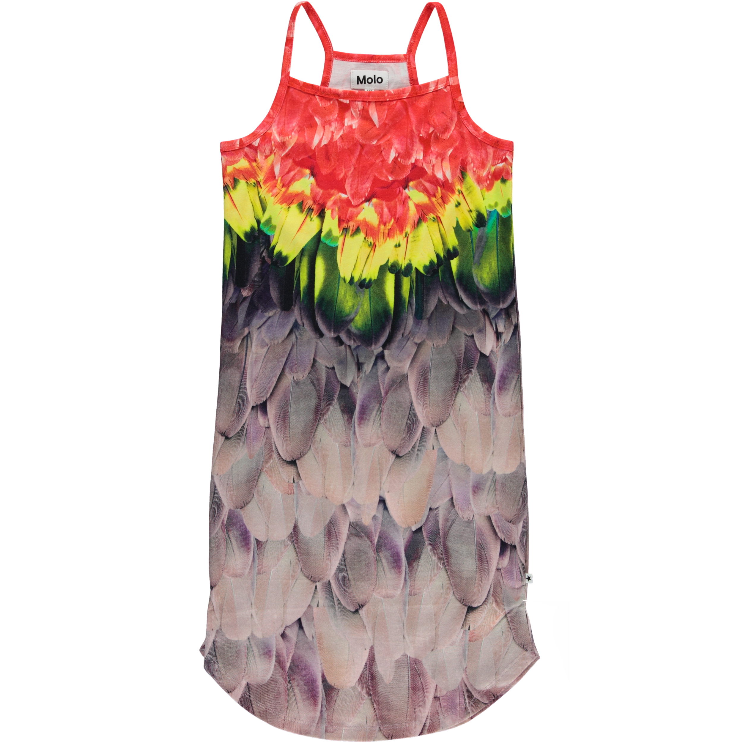Farverige papegøje fjer danner printet på stropkjolen Cortney. Så klæd dig i papegøjens flotte fjerpragt og flyv ud i sommeren.